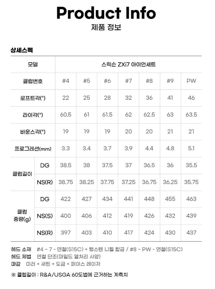 항목내용제품명 Srixon ZXi 7 Iron (스릭슨 ZXi 7 아이언) 출시 2025년형 헤드 구성 #4 ~ #9 + PW (7아이언 세트) 로프트 7번: 32°, PW: 46° 설계 i-FORGED 단조 / 캐비티백 / 투어형 헤드 샤프트 옵션 NS PRO 950GH / Dynamic Gold S200 대상 중급 ~ 상급 골퍼 가격대 약 1,350,000원 (공식몰 기준)