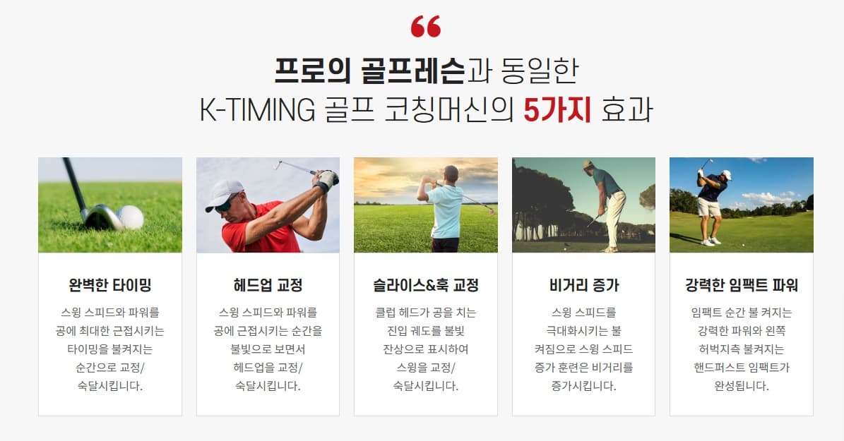 기능설명🔊 피드백 소리 정확한 릴리즈 시 ‘툭’ 소리 발생 💡 LED 기능 K-TIMING 고급형은 불빛 피드백도 가능 🔁 반복 사용 어디서든 반복 훈련 가능 🏌️♂️ 풀스윙 교정 릴리즈, 타이밍, 임팩트까지 체득 ⚖️ 균형 잡힌 무게감 실제 골프채 느낌 유사 📏 길이 조절 사용자 신장에 맞게 커스터마이징 가능