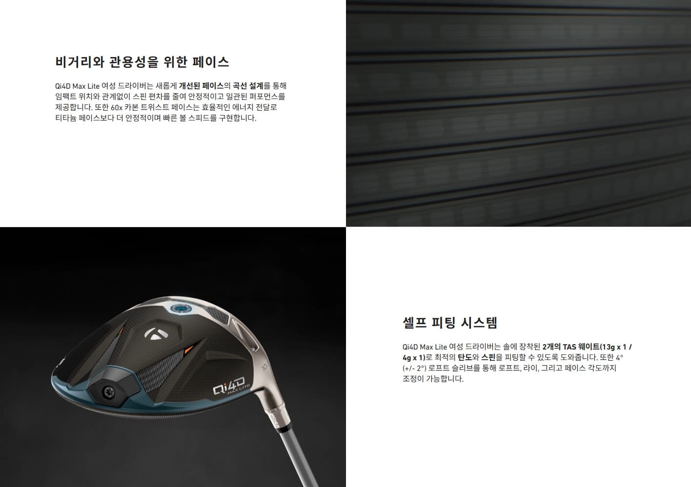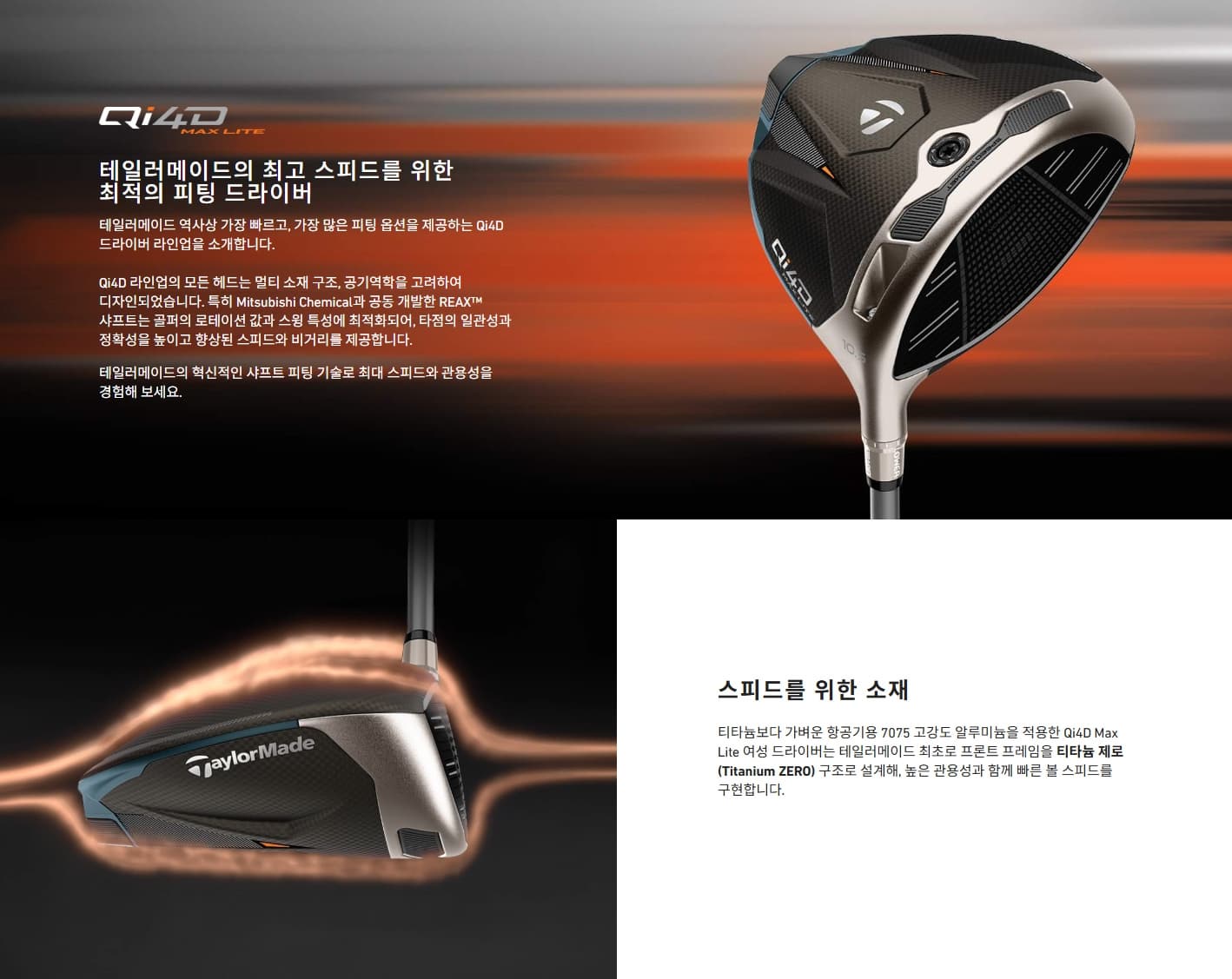 항목내용모델명 TaylorMade Qi4D Max Lite Women’s Driver 로프트 10.5° / 12.0° 길이 44.5인치 무게 약 260g 헤드 용량 460cc 샤프트 REAX 45 Lite (여성 전용) 페이스 60X Carbon Twist Face 출시일 2026년 1월 소비자가 약 989,000원 https://www.taylormadegolf.co.kr/taylormade/qi4d-max-lite-women%27s-driver/DW-TH06W.html?lang=ko_KR