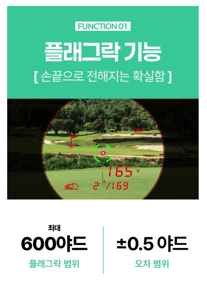 항목사양측정 거리 최대 1,200야드 (약 1,095m) 정확도 ±0.5야드 배율 6배율 광학 렌즈 디스플레이 OLED (빨강/흰색 듀얼 모드) 충전 방식 USB Type-C 무게 약 185g 크기 105 × 72 × 43mm 방수 등급 IPX5 슬로프 기능 ON/OFF 가능 보증 1년 무상 A/S