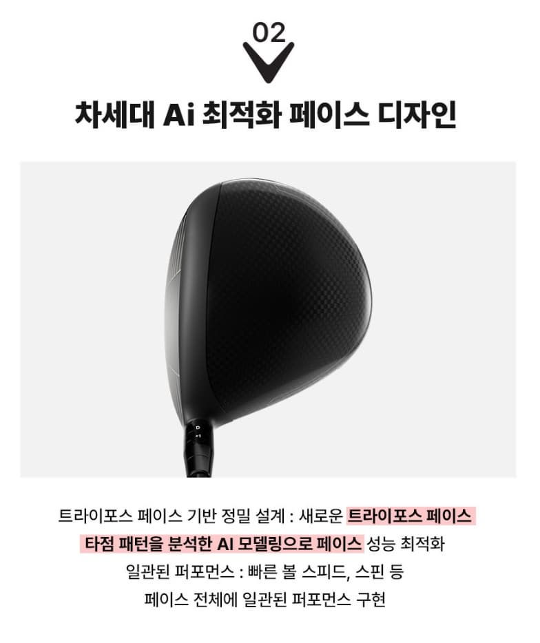 기술명설명🧠 AI Smart Face 3.0 인공지능이 타구 데이터 5억 건을 학습해 반발 영역을 최적화 💨 Aero Quantum Design 공기 저항을 15% 줄여 헤드 스피드 향상 🪶 Carbon Chassis 2.0 무게 45g 경량화, 중심 하단 이동으로 관용성 강화 🔧 Adjustable Weight System 페이드/드로우 구질 세팅 가능 🔊 Sound Core Chamber 임팩트 타구음 개선, 묵직한 사운드 제공 🏌️♂️ MAX 안정 헤드 구조 MOI(관성모멘트) 9,000 이상으로 미스샷 보정력 강화