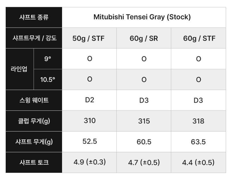 항목내용로프트 9°, 10.5° 헤드 크기 460cc 무게 약 200g 페이스 소재 AI Smart Titanium 3.0 샤프트 Fujikura Ventus TR Blue / Mitsubishi Kai’Li White 샤프트 옵션 R / S / X 중심 무게 조정 12g / 2g 가변 웨이트 출시가 약 1,090,000원 출시일 2026년 2월