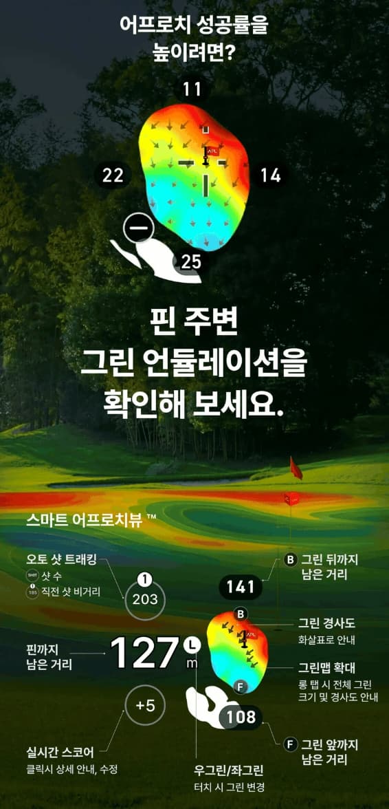 단순 거리 확인용 디바이스가 아닙니다.AI 기반 코스 전략, 자동 핀 인식, 슬로프 보정,