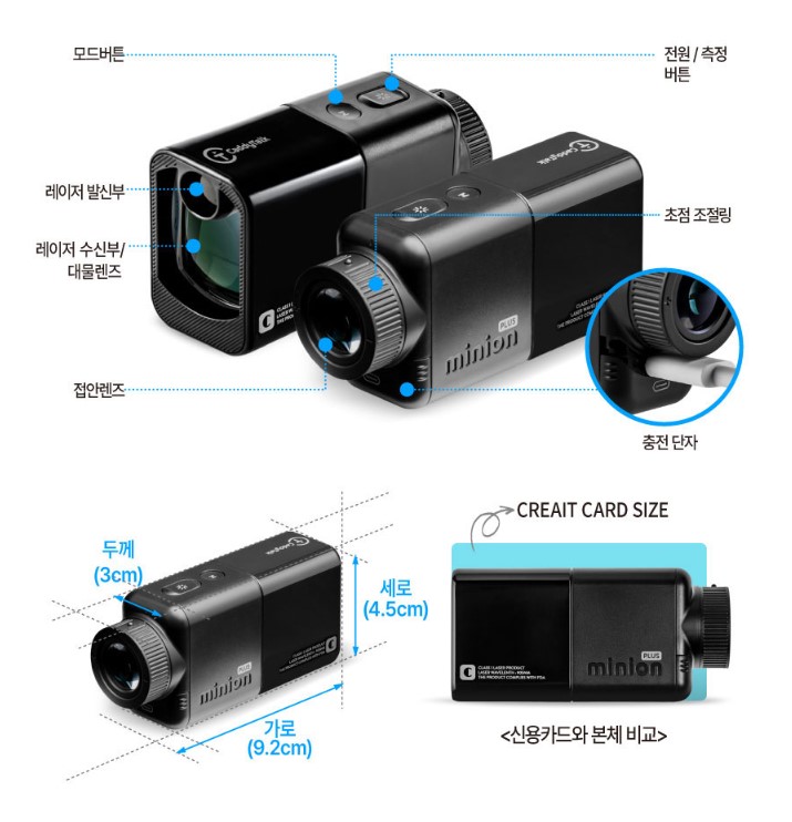 항목사양제품명 캐디톡 미니온 플러스 (MINION PLUS) 무게 99g 배율 6배율 최대 거리 측정 약 800m 측정 정확도 ±1m 기능 슬로프 보정, 핀 파인더, 진동 알림, 캐디모드(삼각측정) 충전 방식 USB-C 충전식 구성품 본체 + 하드케이스 + 충전 케이블 + 렌즈 클리너 색상 화이트 / 핑크 / 민트 외 출시가 약 248,000원 실구매가 약 209,000 ~ 219,000원