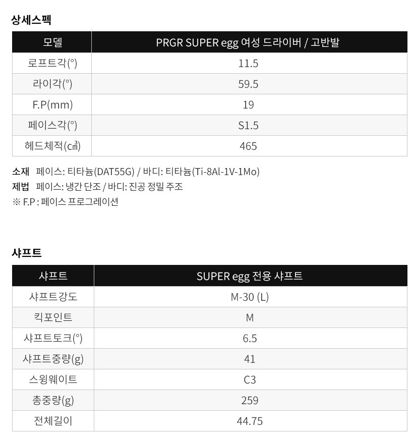 항목내용브랜드 PRGR (프로기아) 모델명 슈퍼에그 여성 드라이버 헤드 체적 485cc (SUPER EGG 485) 로프트 옵션 10.5도 / 11.5도 (L 샤프트 기준) 샤프트 옵션 SUPER EGG 전용 L 플렉스 (40g) 반발 성능 초고반발 (비공인 모델 포함) 출시년도 2024년형 (슈퍼에그 500 포함) 예상 가격대 약 1,750,000원 ~ 2,300,000원 (옵션별 상이)