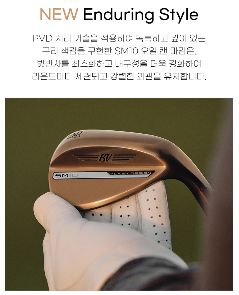 항목내용브랜드 Titleist (타이틀리스트) 라인업 Vokey Design SM10 모델명 SM10 오일 캔 웨지 (Oil Can Finish) 출시일 2025년 3월 한정 출시 마감 방식 오일캔 피니시 (구리색 PVD 처리) 구성 48˚, 50˚, 52˚, 54˚, 56˚, 58˚ (F, S, M 그라인드) 샤프트 다이나믹골드 S200 (기본) 그립 보키 전용 투어 벨벳 그립 가격대 약 360,000원 특징 클래식 감성 + 최신 스핀 밀드 기술 + 고정밀 로프트