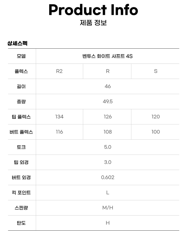 항목성능 특징무게 40g대의 초경량 샤프트 (R2, R, S 스펙) 대상 골퍼 스윙 스피드가 낮은 여성, 시니어, 초보 골퍼까지 사용 가능 기술력 후지쿠라 벨로코어+ 기술 탑재