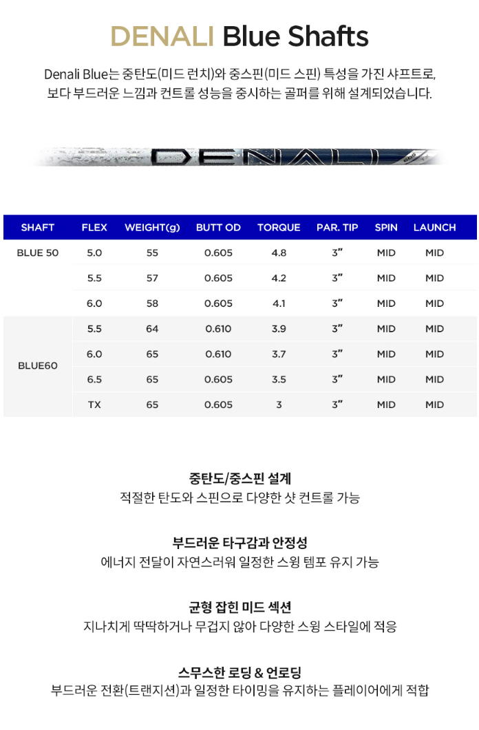 항목내용브랜드 PROJECT X (TRUE TEMPER) 제품명 DENALI BLUE 출시일 2024년 3월 25일 주요 특징 중탄도 / 중스핀 / 리듬감 우수 / 중간 무게중심 플렉스 5.0, 5.5, 6.0, 6.5, TX 등 무게 범위 약 55g ~ 70g대 킥 포인트 미드킥 (중간 발사 지점) 대상 골퍼 중상급자 / 적당한 컨트롤과 유연함을 원하는 유저 가격대 약300,000 ~ 600,000원 (국내 기준)