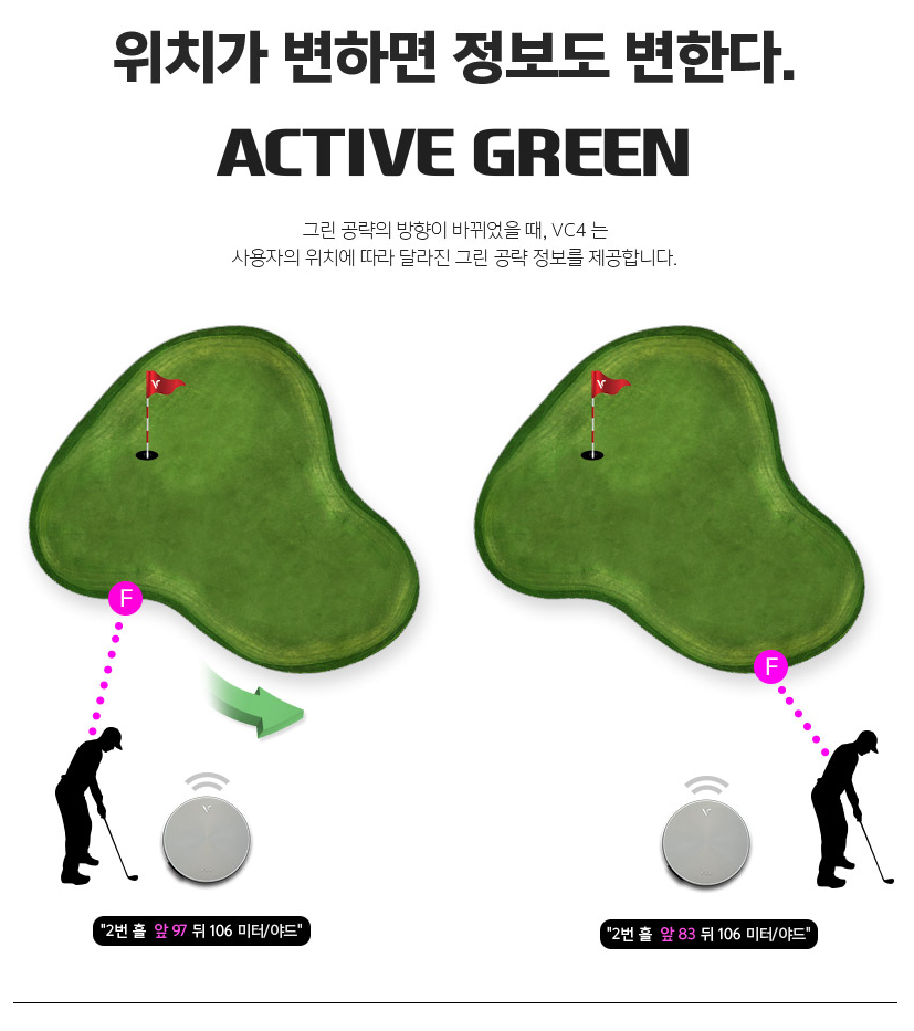 - "그린 중앙까지 147m, 뒤핀까지 162m" 등 음성으로 제공