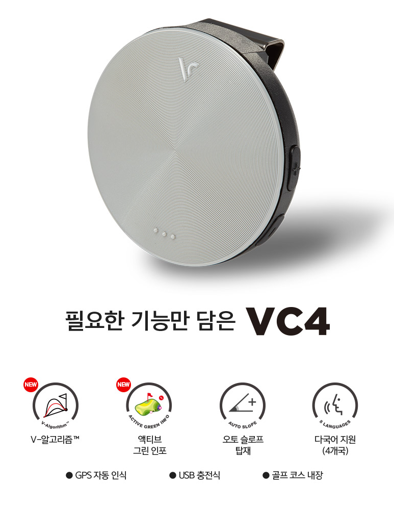 항목상세 내용브랜드 Voice Caddie (보이스캐디) 모델명 VC4 타입 GPS 음성형 거리측정기 주요 기능 앞/중앙/뒤핀 거리 음성 안내 / 고저차 자동 보정 / 오토홀 전환 / 방향 안내 (에이밍 VC4+) 무게 28.5g 크기 48mm × 48mm × 13mm 배터리 시간 약 15~20시간 충전 방식 USB Type-C 지원 골프장 전 세계 약 40,000개 이상 출시가 약 179,000원 (현재 약 129,000 ~ 149,000원)