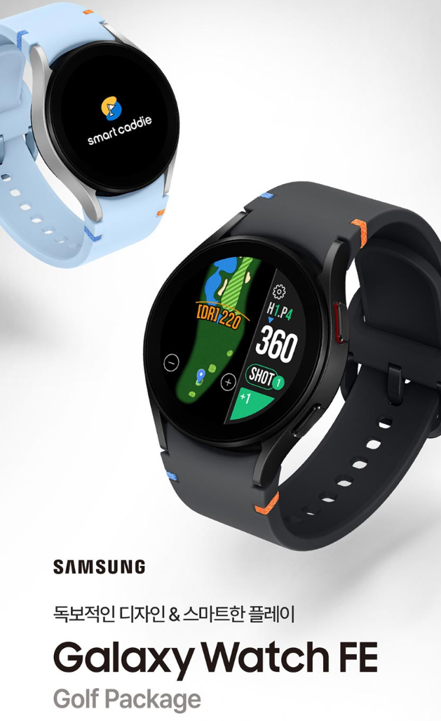 항목내용제품명 Samsung Galaxy Watch FE Golf Package 출시일 2024년 6월 예정 디스플레이 1.2인치 슈퍼 아몰레드 (360x360) 배터리 최대 40시간 (일반모드), 골프 모드 약 15시간 이상 GPS 기능 단독 내장형 GPS + 고저차 보정 앱 연동 스마트캐디 (Smart Caddie) 앱 탑재 지원 골프장 전 세계 약 40,000개 골프장 무게 약 28.7g (스트랩 제외) 가격 약 289,000원 (골프 패키지 전용) - 25.5. 현재 골프존 마켓 할인중 129,000원