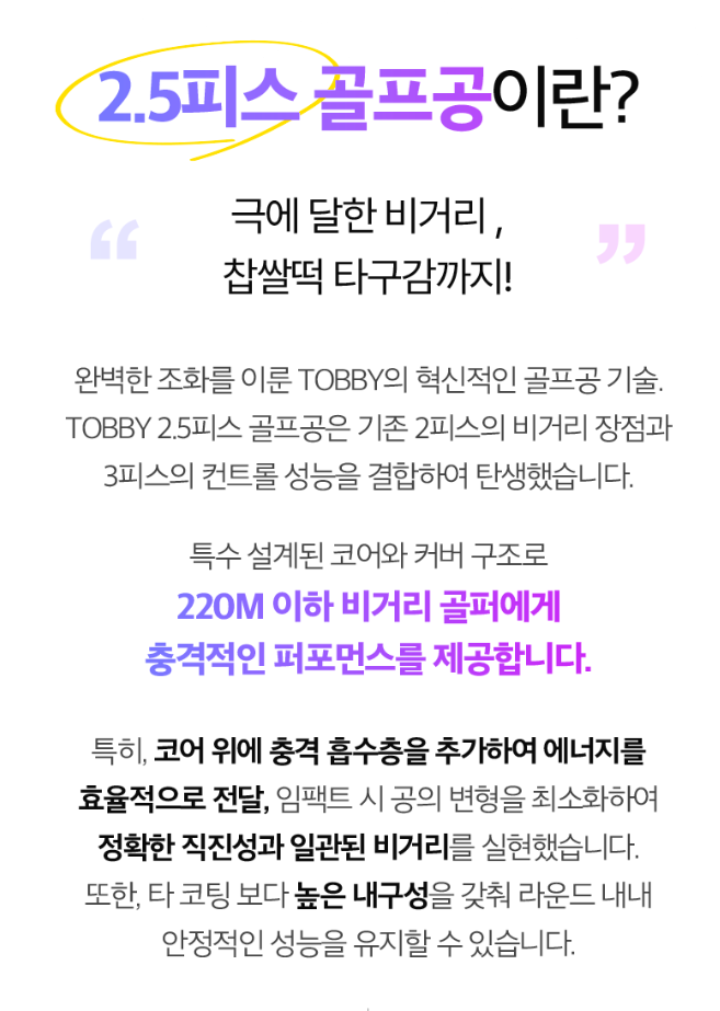 2피스의 장타 비거리 성능을 동시에 구현 - 저압축 퓨전 코어 → 고반발력 + 부드러운 타감