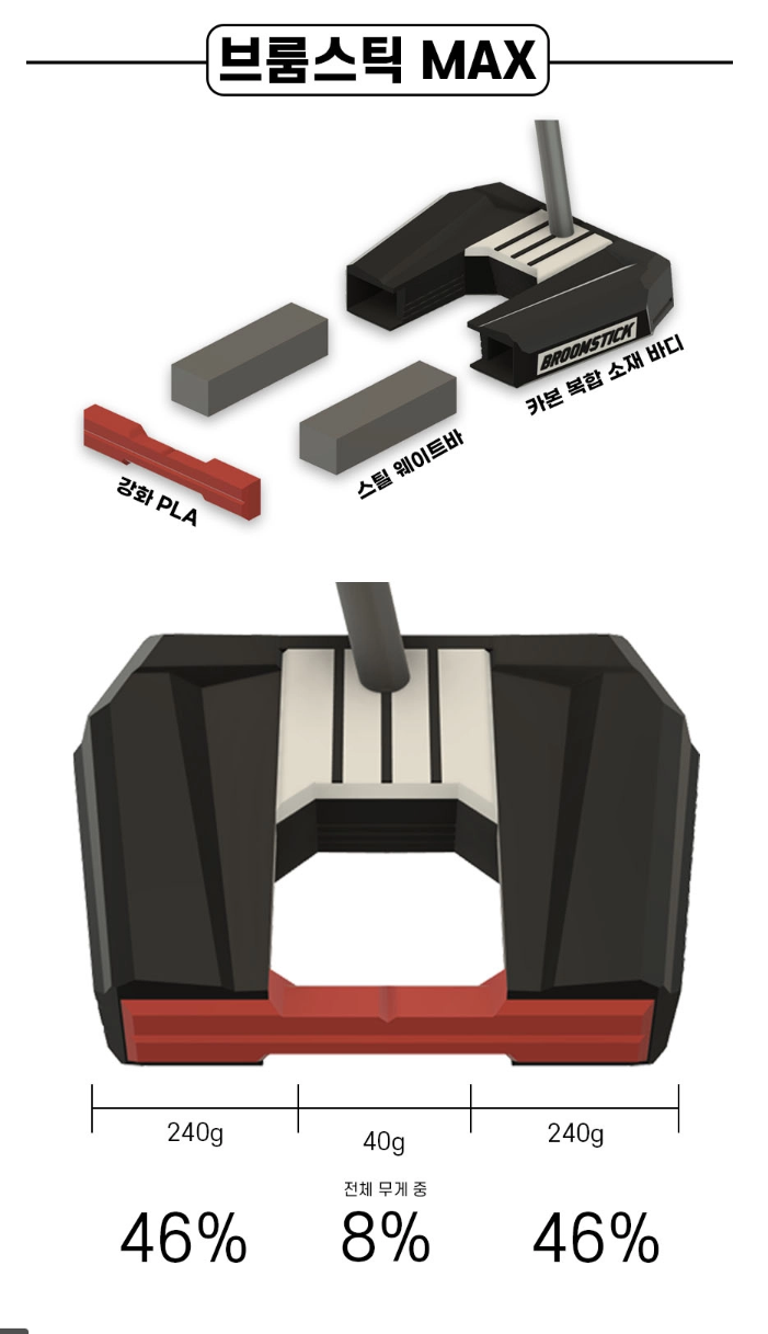 항목내용브랜드 GULIMCHAE (굴림채) 제품명 브룸스틱 프로 맥스 퍼터 (Broomstick Pro Max) 구조 롱퍼터형 + 제로토크 중심 설계 샤프트 길이 약 43~46인치 (사용자 맞춤 가능) 퍼터 타입 말렛형 주요 특징 스퀘어 자동 정렬, 손목 개입 최소화, 흔들림 방지 구조 무게 약 580~600g 소비자 가격 약 420,000 ~ 460,000원 제조국 대한민국