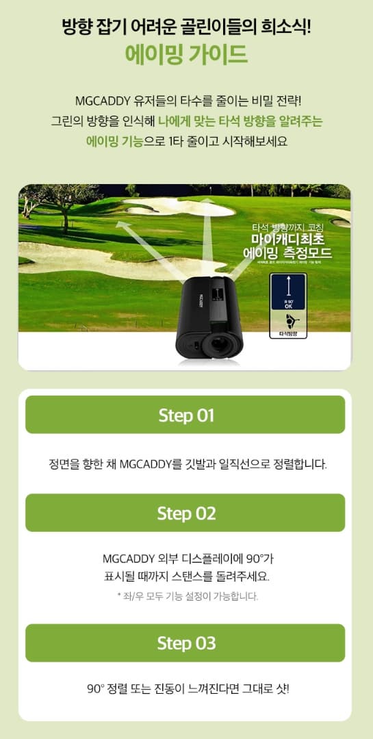 대상이유중급자 이상 골퍼 정확한 거리 정보 + 방향 정렬 필요 샷 정렬이 고민인 골퍼 에이밍 기능으로 셋업 보조 필드에서 빠르게 거리 확인하고 싶은 분 OLED 측면 디스플레이 활용 가능 기존 거리측정기 업그레이드를 원하는 분 종합 기능 모두 탑재된 프리미엄형