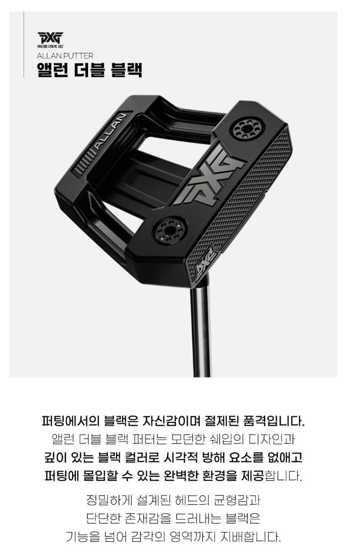 이 퍼터가 단순히 ‘멋진 외형’을 넘어 실제 퍼포먼스까지 챙긴 완성형 퍼터임을 입증합니다.프리미엄 퍼터를 찾는 골퍼라면, PXG Allan Double Black은 반드시 경험해볼 가치가 있습니다.